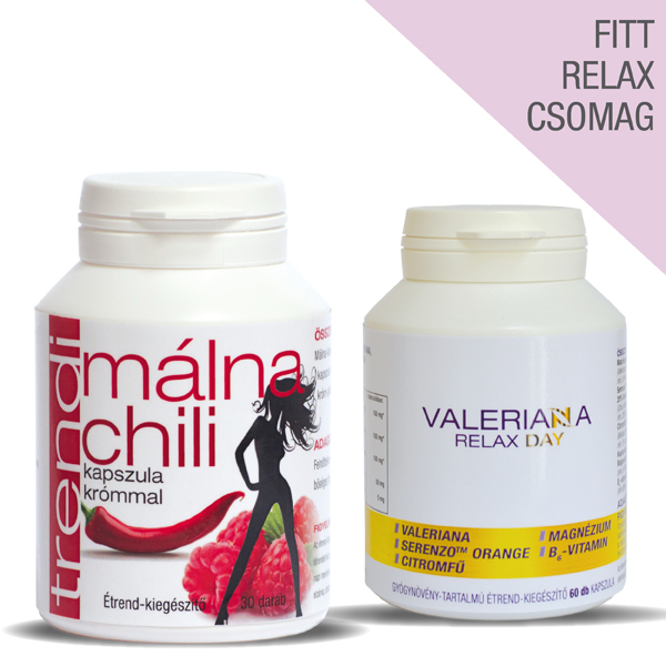 Fitt Relax csomag tartalma : 1 db Trendi Málna Chili krómmal + 1 db Valeriana Relax Day termék